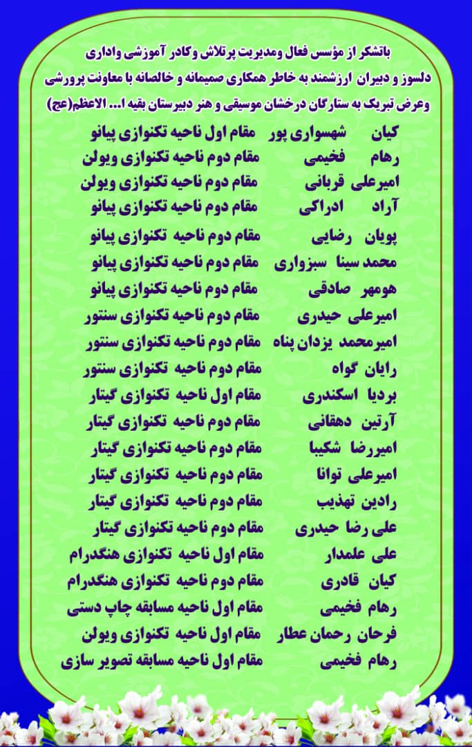 با تشکر از مؤسس فعال و مدیریت پرتلاش و کادر آموزشی و اداری دلسوز و دبیران ارزشمند به خاطر همکاری صمیمانه و خالصانه با معاونت پرورشی و عرض تبریک به ستارگان درخشان موسیقی و هنر دبیرستان بقیه‌الله الاعظم (عج) 🙏🏻🌹