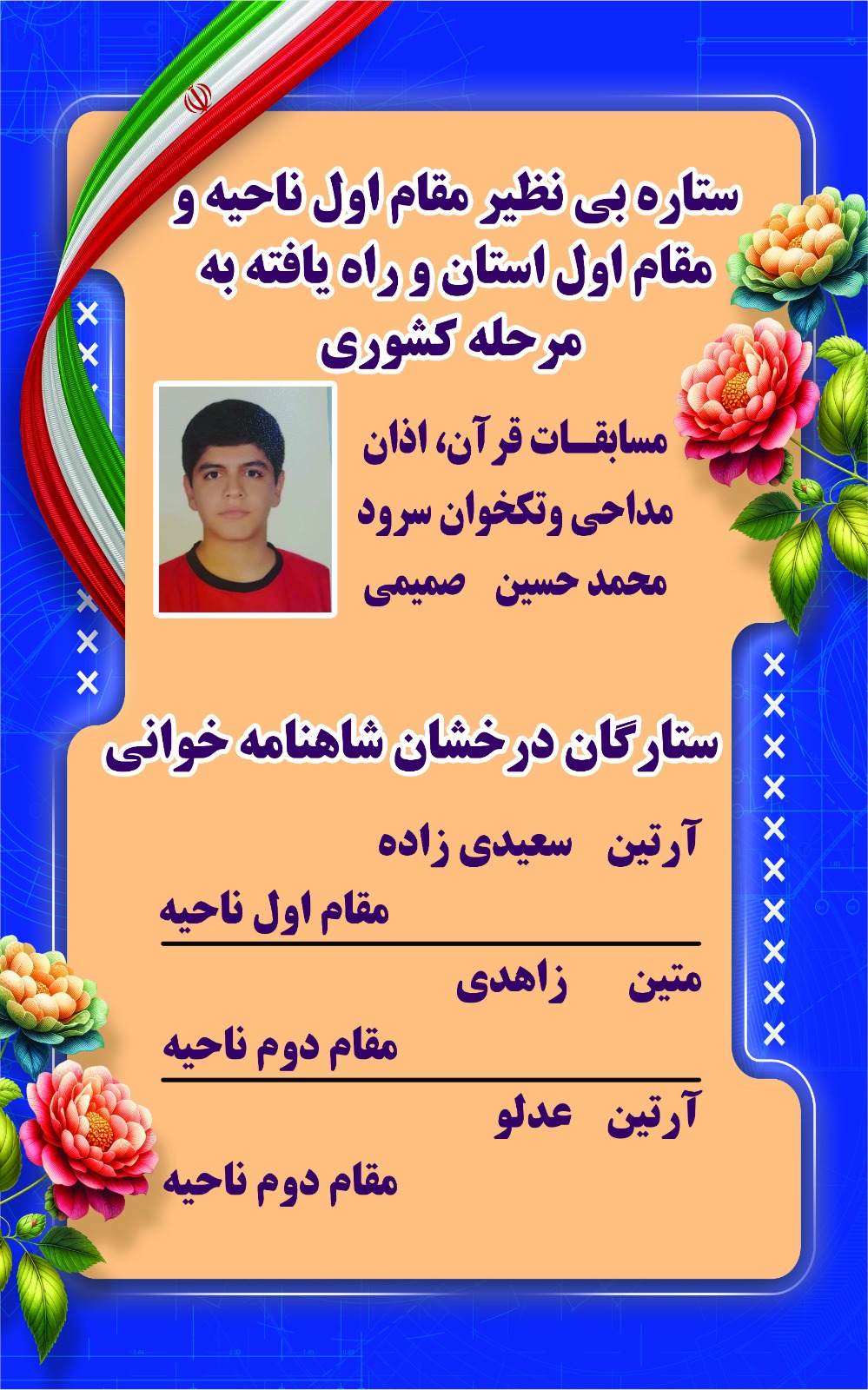 ستاره بینظیر مقام اول ناحیه و مقام اول استان و راه یافته به مرحله کشوری در مسابقات قرآن، اذان، مداحی و تکخوان سرود: